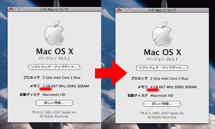 うまく認識してくれました。ネットで調べてたら、僕の買った07後期のmacbookだと4Gをちゃんと認識してくれるらしいね^^